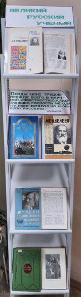 К юбилею Д.И.Менделеева оформлена выставка «Великий русский ученый». В представлении большинства людей он в первую очередь химик, создавший периодическую систему элементов. Но оказывается, собственно химии посвящено менее одной десятой части менделеевских трудов. И с гораздо большим основанием Менделеева можно было бы считать физико-химиком, технологом, экономистом, геофизиком, метрологом.