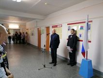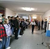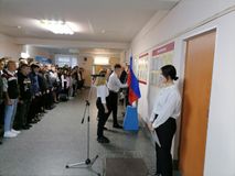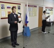 Знаменная группа, в составе студентов группы №29 «Повар, кондитер»: Губаль Ангелина, Литвинова Ирина и Платонов Павел, внесла и установила флаг.