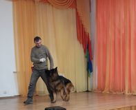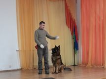 Ребятам рассказали о подготовке кинологов, особенностях воспитания собак, а затем, студенты продемонстрировали навыки по дрессуре своих питомцев.