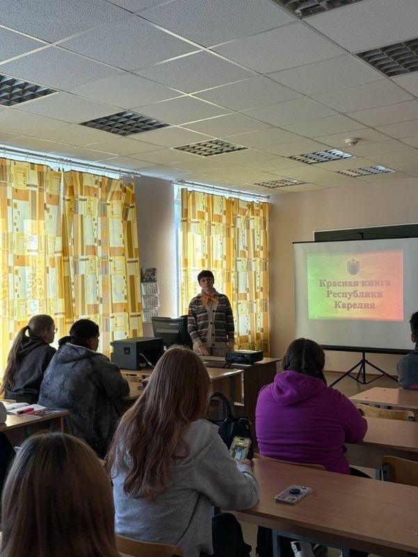 Советник директора по воспитанию Погодина А.В. провела беседу со студентами групп ОИС-3 и ПТ-23, в которой рассказали о первом и о последующих изданиях Красной книги Республики Карелия, представителях флоры, млекопитающих, рыбах, птицах, внесённых на её страницы и очень нуждающихся в защите человека. Продемонстрировала лучшие видеоролики на данную тему, сделанные группой ОИС-1.