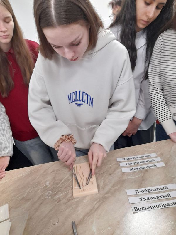 Преподаватель специальных дисциплин Светлинская Влада Дмитриевна рассказала ребятам о подготовке специалистов по спец. Ветеринария, показала оборудование клиники, познакомила школьников с особенностями практического обучения студентов. Во время практической части занятия школьники попробовали себя в качестве хирурга. Они учились накладывать швы на манекене.