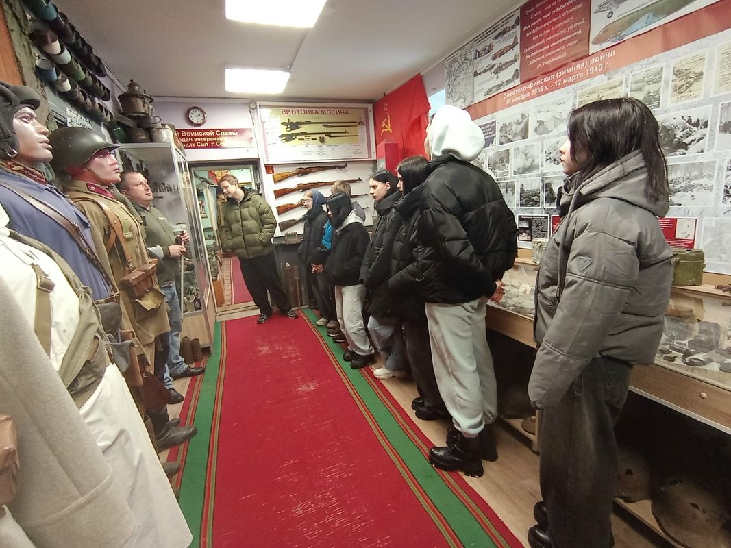 Студенты групп 712 и 311 вместе с классным руководителем Екатериной Алексеевной Бориной и педагогом-организатором Валентиной Алексеевной Героевой посетили военно-патриотический музей города Сортавала. Экскурсию провел ветеран боевых действий Сергей Владимирович Чернобай. Он подробно рассказал студентам о событиях блокады Ленинграда, героической эвакуации по льду Ладожского озера, а также затронул тему русско-финской войны.