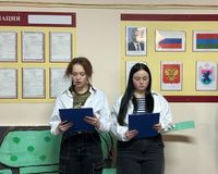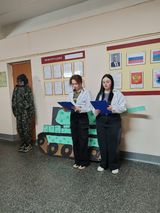 Ведущие линейки Андреева Дарья и Скрыпникова Анастасия, студентки группы №19, произнесли слова и стихотворения о патриотизме, о подвиге, о героях, защитниках нашей великой Родины.
