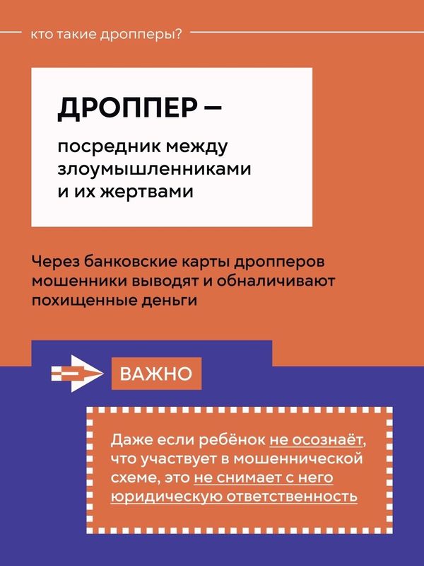 Дропперы (сокращённая версия термина — дропы) — посредники в нелегальных схемах, связанных с финансовыми операциями. Их задача — получить на свой счёт деньги, добытые незаконным путём, и затем перевести их другим лицам, чаще всего за определённое вознаграждение.